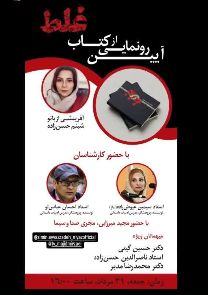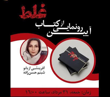 یاشار محمدی خبرنگار موج نو نیوز، آیین رونمایی از کتاب «غلط» نوشته شبنم حسنزاده، روز جمعه ۳۱ مردادماه ساعت ۱۶ در مجتمع فرهنگی نور واقع در بلوار آیتالله کاشانی برگزار گردید.