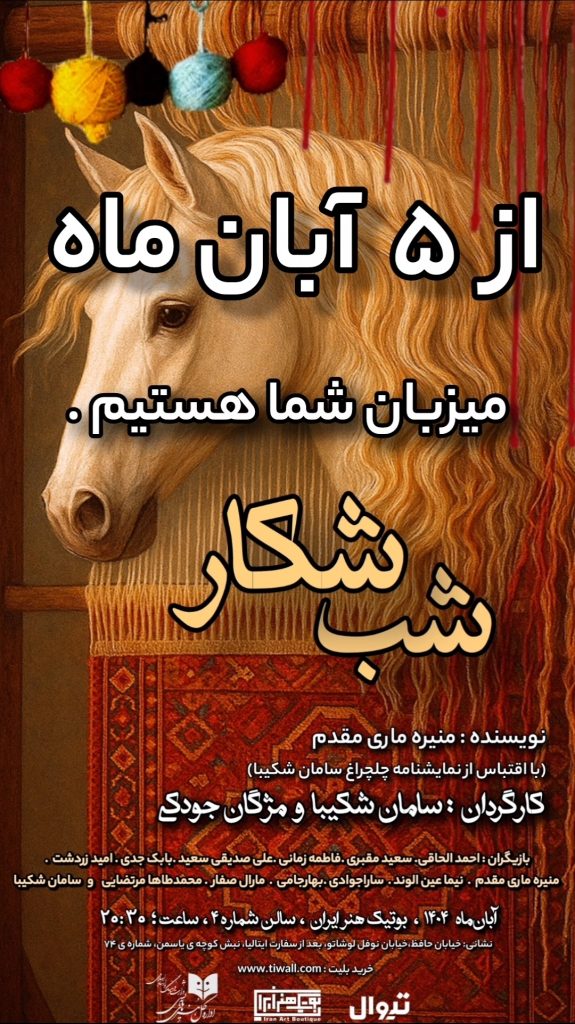 علیرضا نیاکان -نمایش «شب شکار»، محصول گروه نمایشی «مضحکه»، به نویسندگی منیره ماری مقدم بر اساس نمایشنامهی «چلچراغ» اثر سامان شکیبا و کارگردانی مشترک سامان شکیبا و مژگان جودکی، از پنجم آبانماه در سالن بوتیک هنر ایران آغاز میشود. این اثر، که تلفیقی از سیاهبازی، آیینهای بومی ترکمن و زبان تختحوضی است، در ظاهر به موضوعات کلاسیک حسادت، انتقام و عشق میپردازد، اما در عمق ساختاری، تلاشی است برای مهندسی معکوسِ مفهوم «تراژدی» در فرهنگ ایرانی.